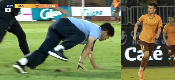 Ở phút bù giờ thứ mười, trung vệ trẻ Đinh Quang Kiệt bật cao đánh đầu tung lưới Thanh Hóa, gỡ hòa 1-1 cho HAGL. Bàn thắng quý như vàng này giúp đội bóng phố Núi thoát khỏi thất bại trong gang tấc và khiến khán giả trên khán đài nổ tung trong niềm vui. Khi tiếng reo hò còn chưa dứt, Vũ Tiến Thành bất ngờ bò hẳn ra mặt sân, khiến cả cầu trường dậy sóng.